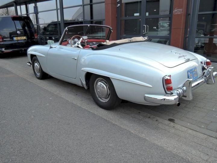 Betreft een redelijk exemplaar deze late versie 190SL, een auto met een leuk uiterlijk, het lakwerk van origine donkergrijs 190G is in het verleden gewijzigd in de kleur zilver metallic 180G en is in een redelijk conditie zo ook het chroomwerk is netjes en past goed, de voorruit omranding mag vroeg of laat verchroomd worden, het rood leder interieur met passend tapijt is in een goede staat, softtop is in een goede conditie, qua body optisch goed echter o.a de vloerbodem-delen hebben aandacht nodig, nieuwe bodem delen zijn reeds aanwezig en gaan mee met de koop, technisch en motorisch loopt en rijdt deze 190SL cabriolet naar behoren, de kwetsbare Solex carburateurs zijn in het verleden vervangen in Mikuni met behoud van luchtfilter en aanzuigbuis, het motor onder blok is in het verleden vervangen door de juiste ruil motor af fabriek, het bovengedeelte met name de cilinderkop is nog origineel.