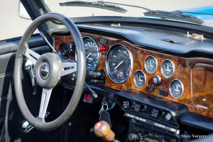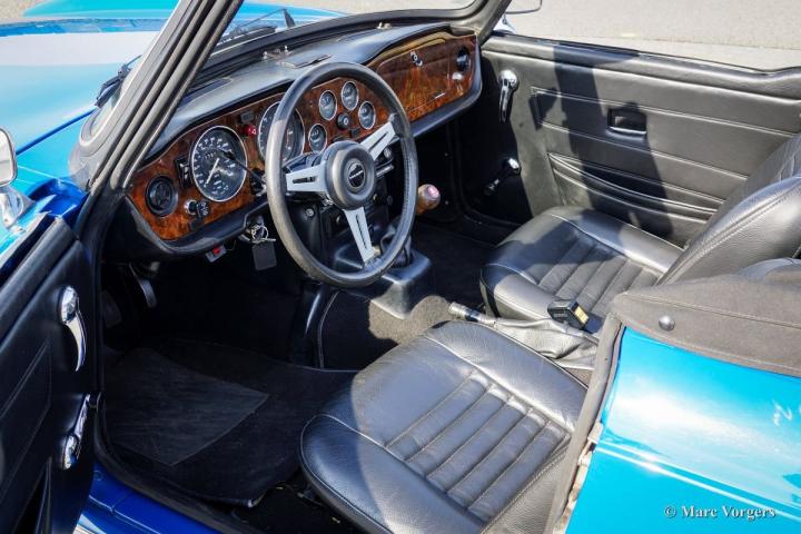 Dit is een zeer nette TR6 die voorzien is van een luxe houten dashboard en een leren stuur.