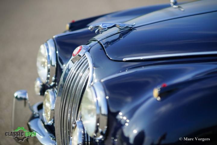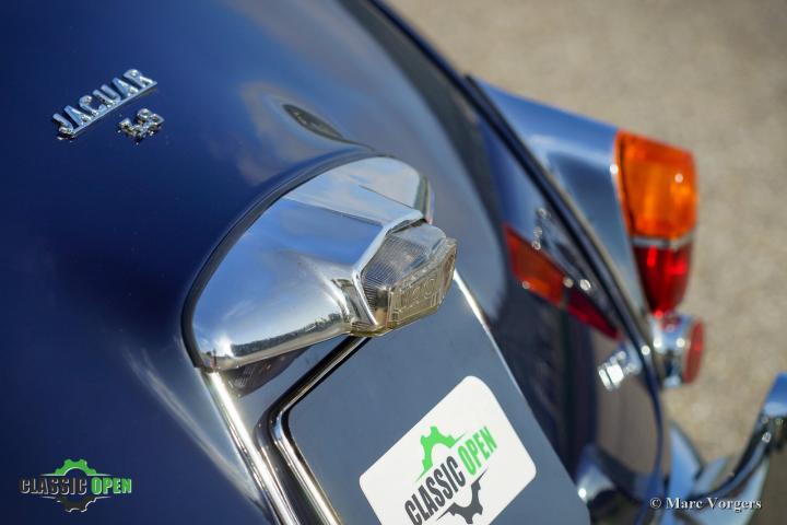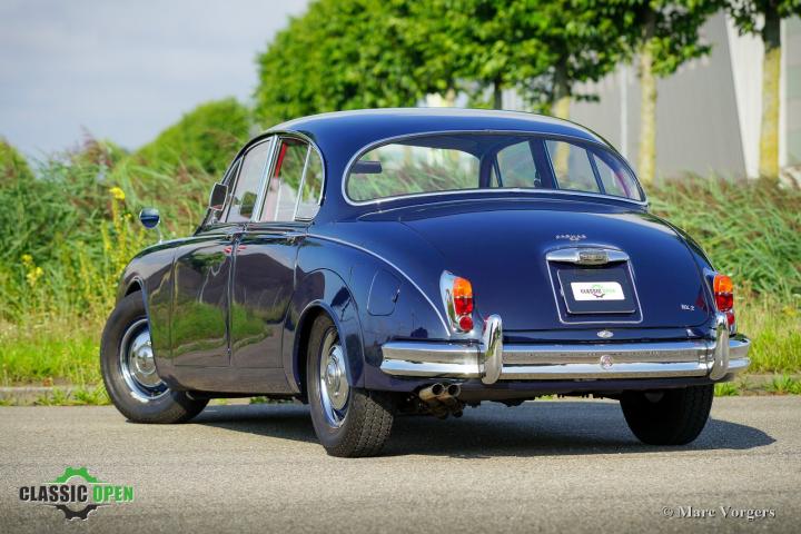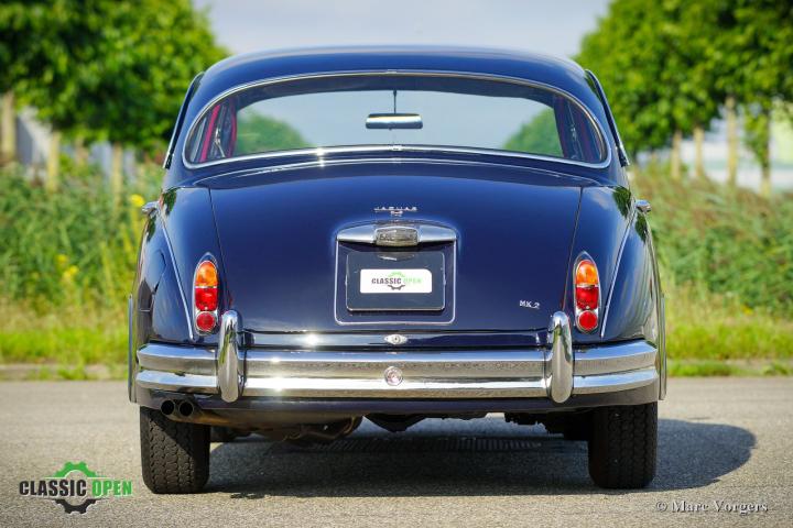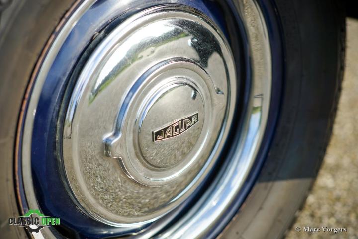 Deze prachtige Jaguar Mk II toont alle originele details waaronder de stalen schijfwielen met chromen wieldoppen en de ‘spats’ over de achterwielen.