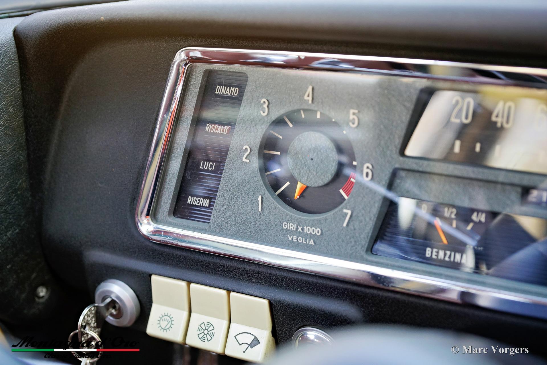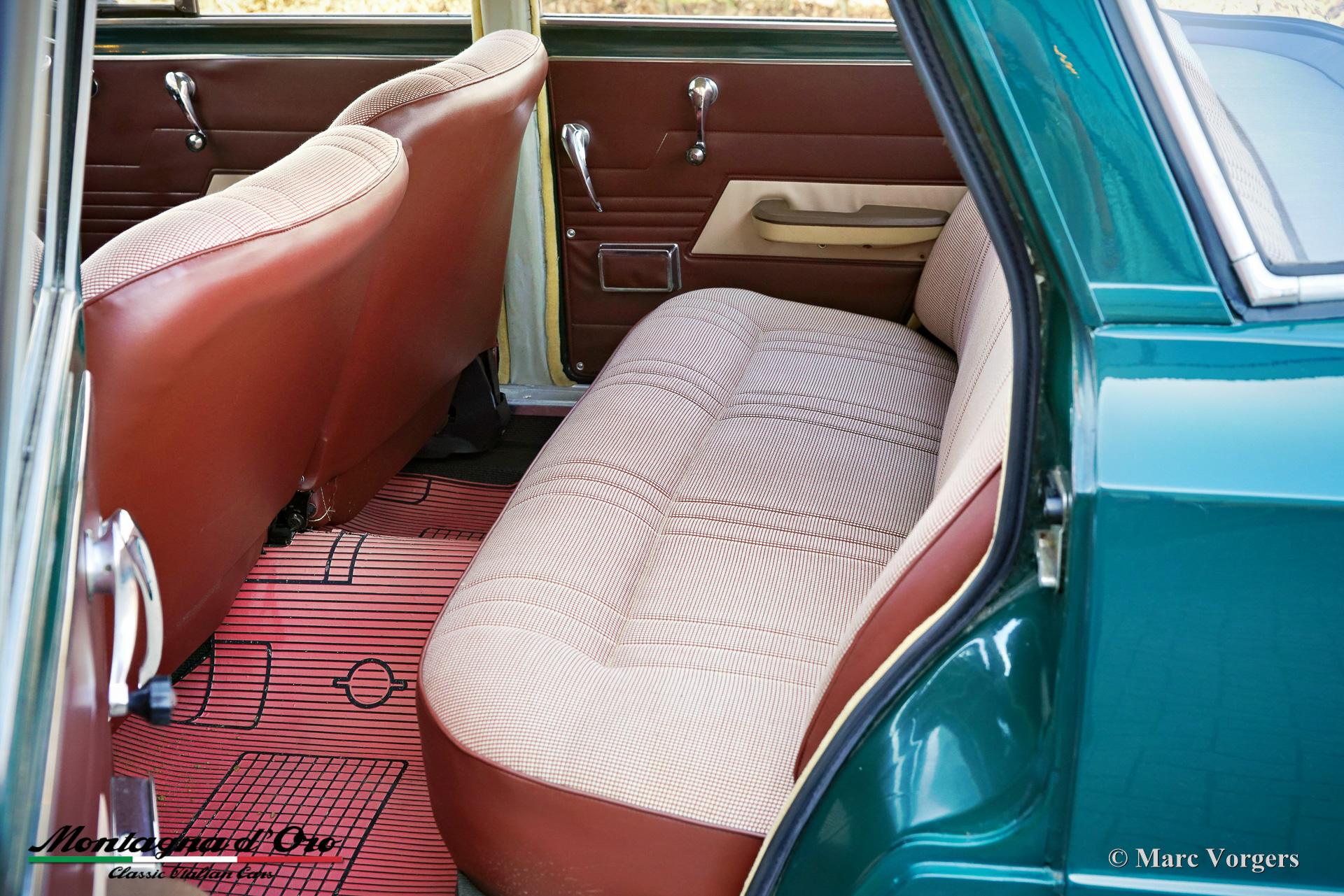 De stoffen stoelvlakken zijn uitgevoerd in een crèmewit/rood geblokt patroon. Deze prachtige Alfa Romeo Giulia 1300 werd nieuw verkocht in Italië aan een zekere dhr. D. Manguesto die in Bari woonde.