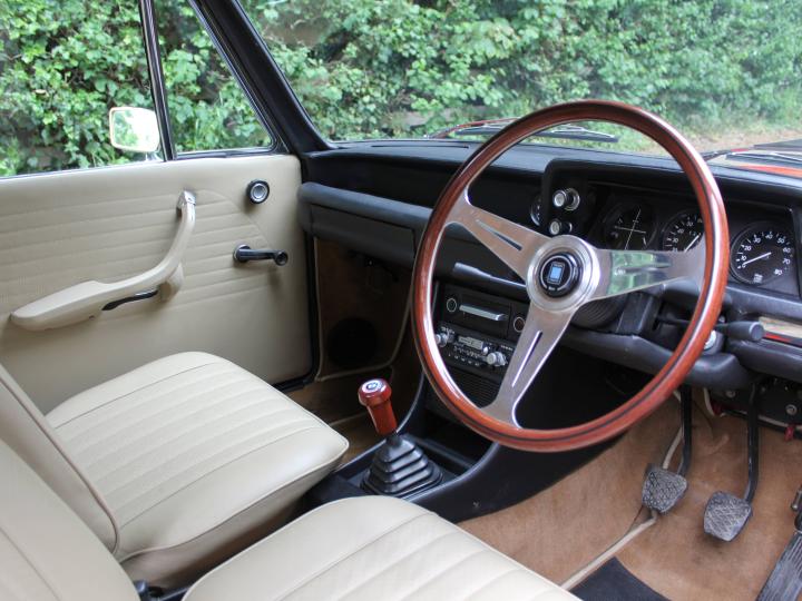 Upon first glance, the striking Red paintwork holds a deep finish with the recently refurbished chromework shining brightly throughout the exterior, enhancing the sleek bodylines of this sports saloon. Raising the car in the air reveals an excellent underside, testament to the quality of the thorough restoration. Inside the cabin you are greeted with beautiful beige leather seats, without any signs of wear contrasted beautifully by Mushroom Brown carpets and the Black leather dash. In the centre of the driver's gaze is a stunning Nardi wood-rim steering wheel that is both comfortable and sporty. The cleanliness and quality continues through to lifting the bonnet, where the powerplant sits among recently replaced or refurbished ancillaries and body-coloured inner wings.