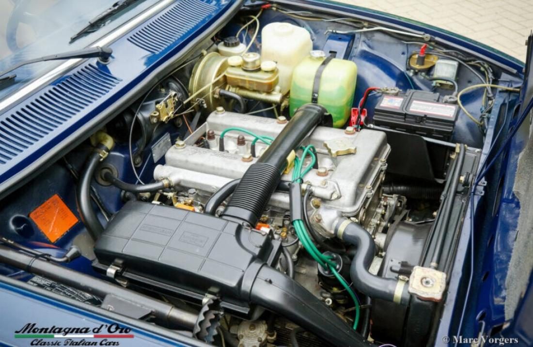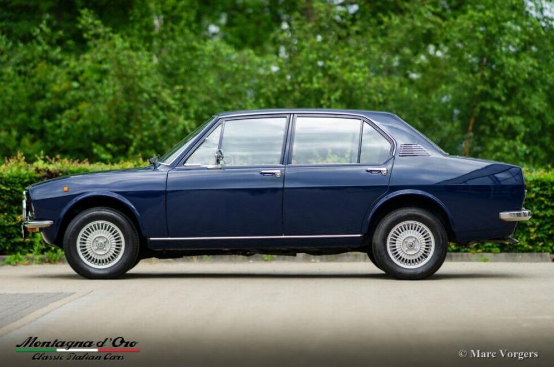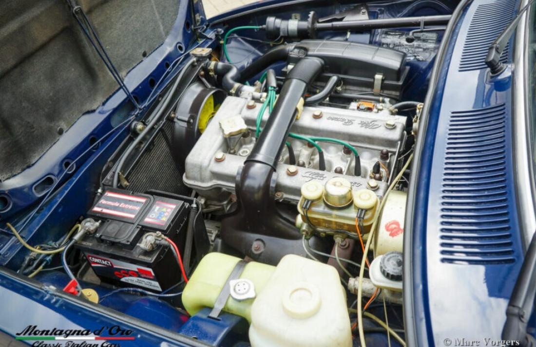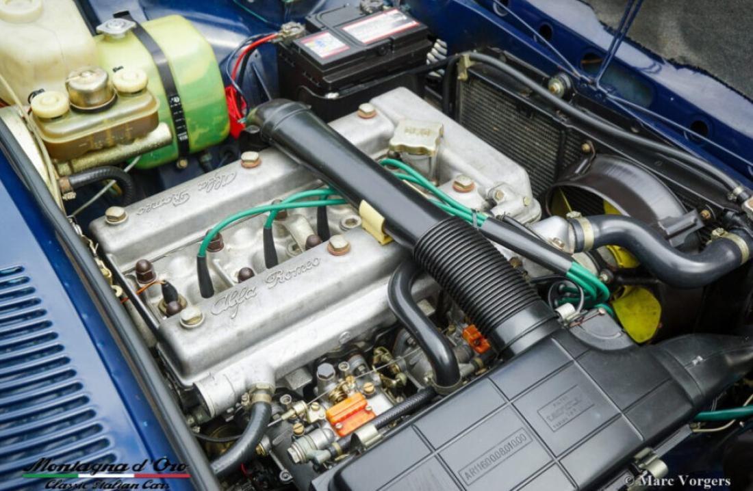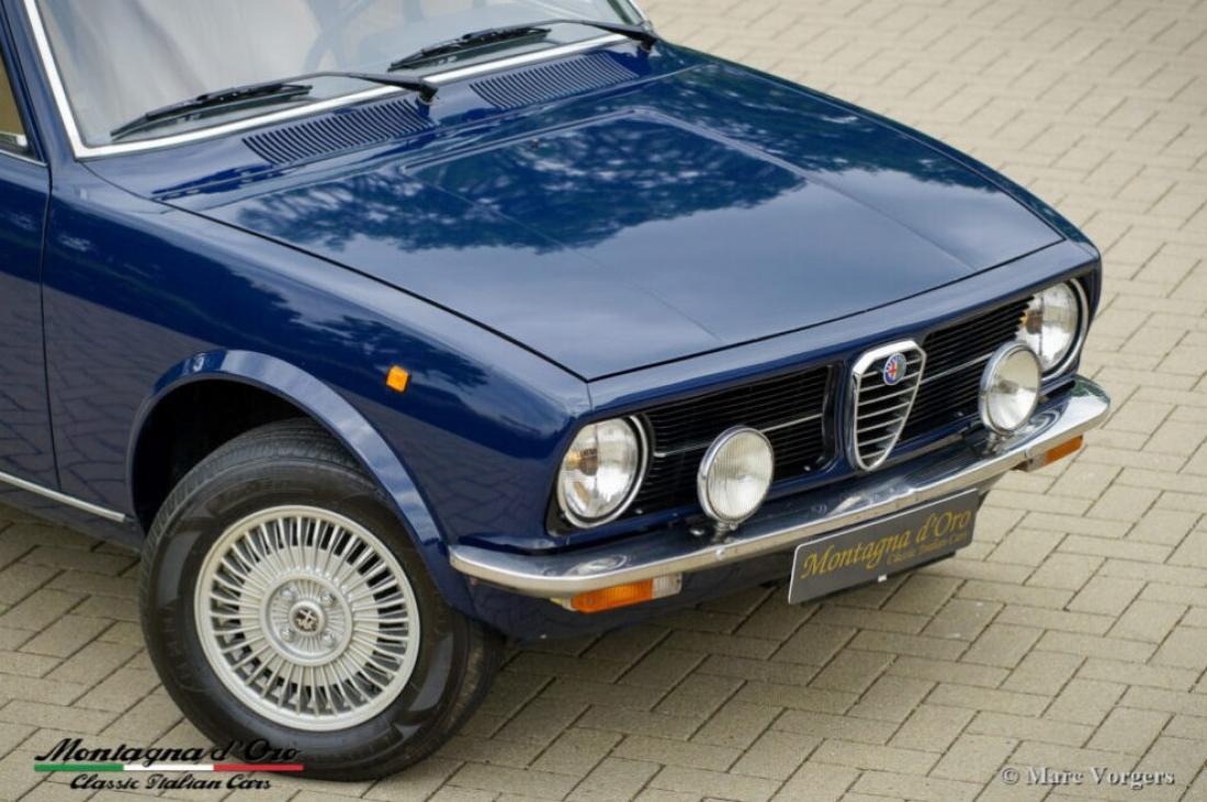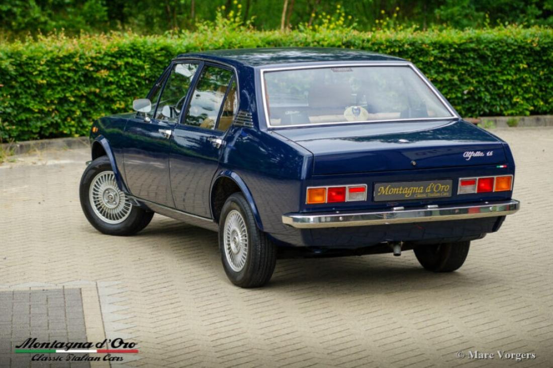 Alfa Romeo Alfetta 1600, jaar 1976. Chassisnummer AR*11600*00399XX, motornummer AR*01600*0561XX* Kleur donkerblauw (Bleu Olandese) gecombineerd met een beige kunstleren interieur, bruin tapijt en grijze beschermmatten met beige randafwerking. Toen de Alfa Romeo Alfetta in 1972 werd geïntroduceerd, was het de eerste middelgrote Alfa sedan in tien jaar. Alfa Romeo introduceerde de nieuwe ‘transaxle’ versnellingsbak tussen de achterwielen op de Alfetta die een bijna perfecte 50/50 gewichtsverdeling mogelijk maakte. Toegevoegd aan de volledig onafhankelijke wielophanging, de sportieve en krachtige aluminium twin-cam motor, de schijfremmen op alle vier de wielen en de vijfversnellingsbak was de Alfetta een echte sportsedan! De gepresenteerde prachtige eerste serie Alfetta is in Italië aangekocht uit de autoverzameling van de 2e Italiaanse eigenaar. De auto heeft onlangs een onderhoudsbeurt gehad in Italië, daarbij zijn de carburateurs gereinigd en gereviseerd. Dit super originele exemplaar verkeert in een zeer goede conditie met enige gebruiks- en ouderdomssporen in het interieur. De teller staat momenteel op 94.989 km. Deze fantastische Alfa Romeo Alfetta 1600 wordt geleverd met Italiaanse papieren en documenten (en een schild gemonteerd achter de achterruit) van de Auto Moto Club Storico Italiano. Dit is een moeilijk te vinden eerste serie Alfetta in prachtige originele conditie!